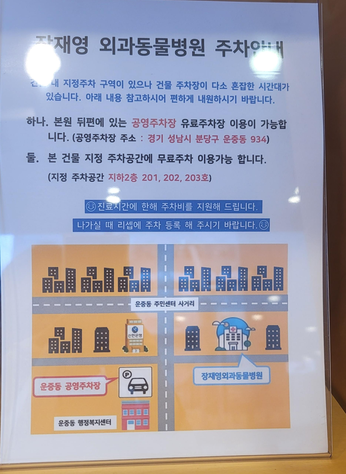 지하에 주차장이 협소한데 조이를 안고 다녀야 해서 무조건 주차장으로 내려갔다. 지하 2층에 동물병원 이용하는 사람들을 위한 세 자리가 있다. 반은 성공 반은 자리가 없었고 지하에 자리가 없을 땐 근처 공영주차장에 차를 세웠다. 주차비를 지원해 주신다. 개모차 있으 신 분들은 속 편하게 공영주차창에 차 세우시고 가는 게 좋겠다.