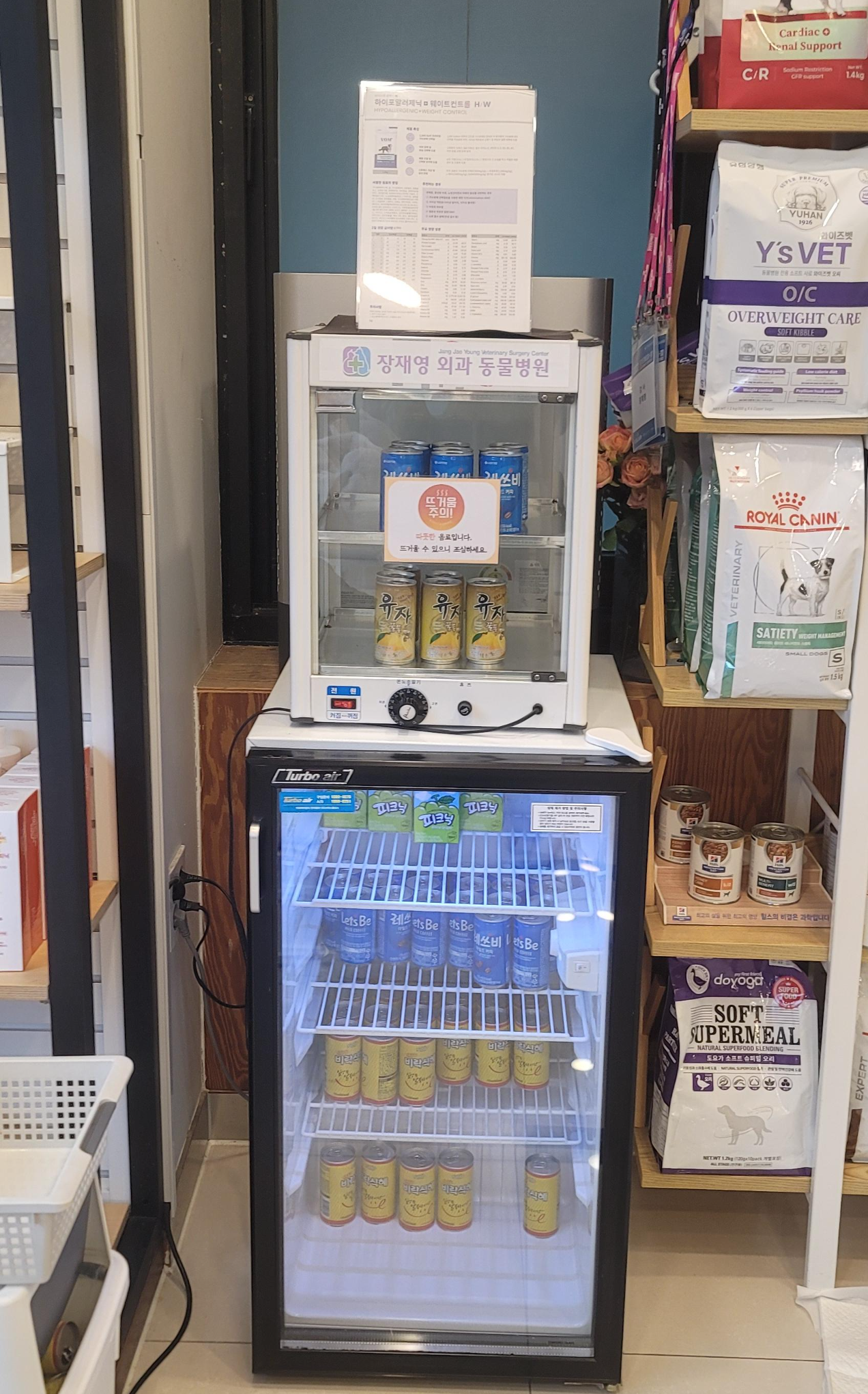 왼쪽부터 보호자를 위해서 준비하신 냉장음료와 따뜻한 음료, 강아지 사료와 간식들이다. 겨울이라 갈 때마다 따뜻한 음료를 마셨던 기억이 난다. 수술비 비싼데 음료수라도 챙겨 먹어야지 라는 마음으로 말이다.