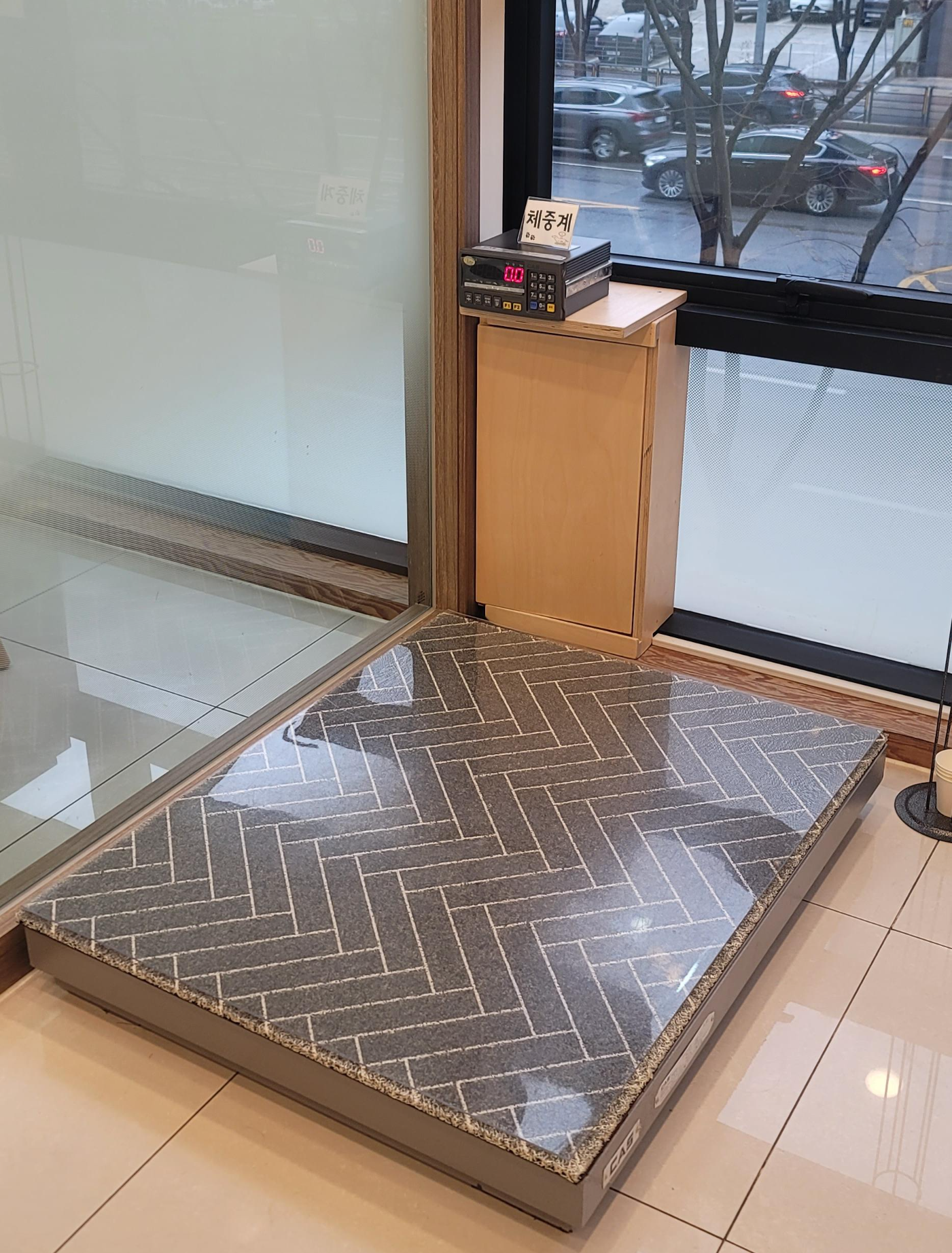병원 들어갈때 마다 큰 거 했던 조이, 배변 패드와 물티슈 바닥 닦는 소독약품이 준비되어 있다. 오른쪽 사진은 체중계, 대형견도 많이 오는 병원이라 체중계도 크다. 강아지 체중 재기 쉽지 않은데 이곳 체중계는 비교적 간단하게 잴 수 있었다.