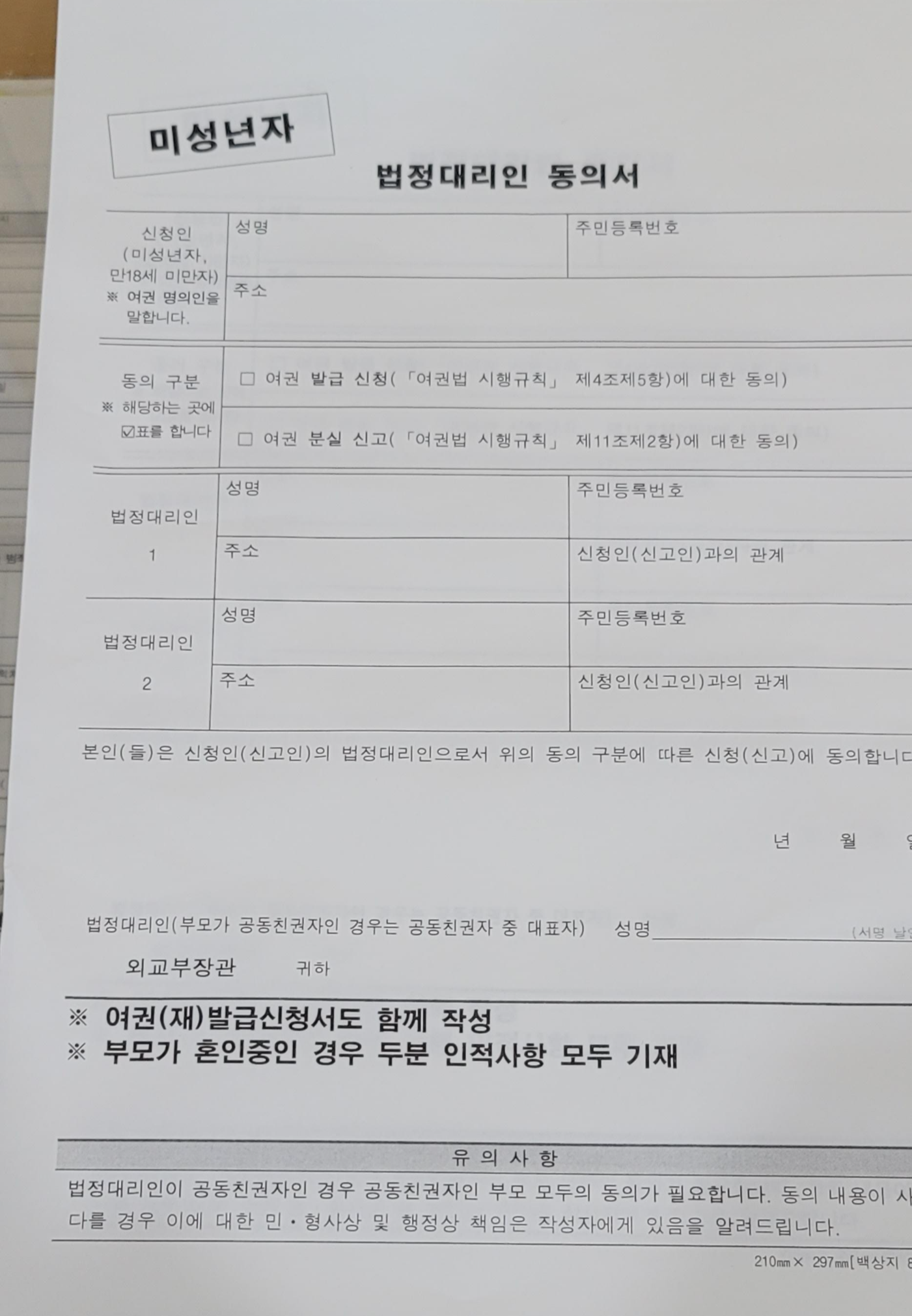 * 여권발급신청서, 법정대리인 동의서는 신청 기관에 비치되어 있습니다.