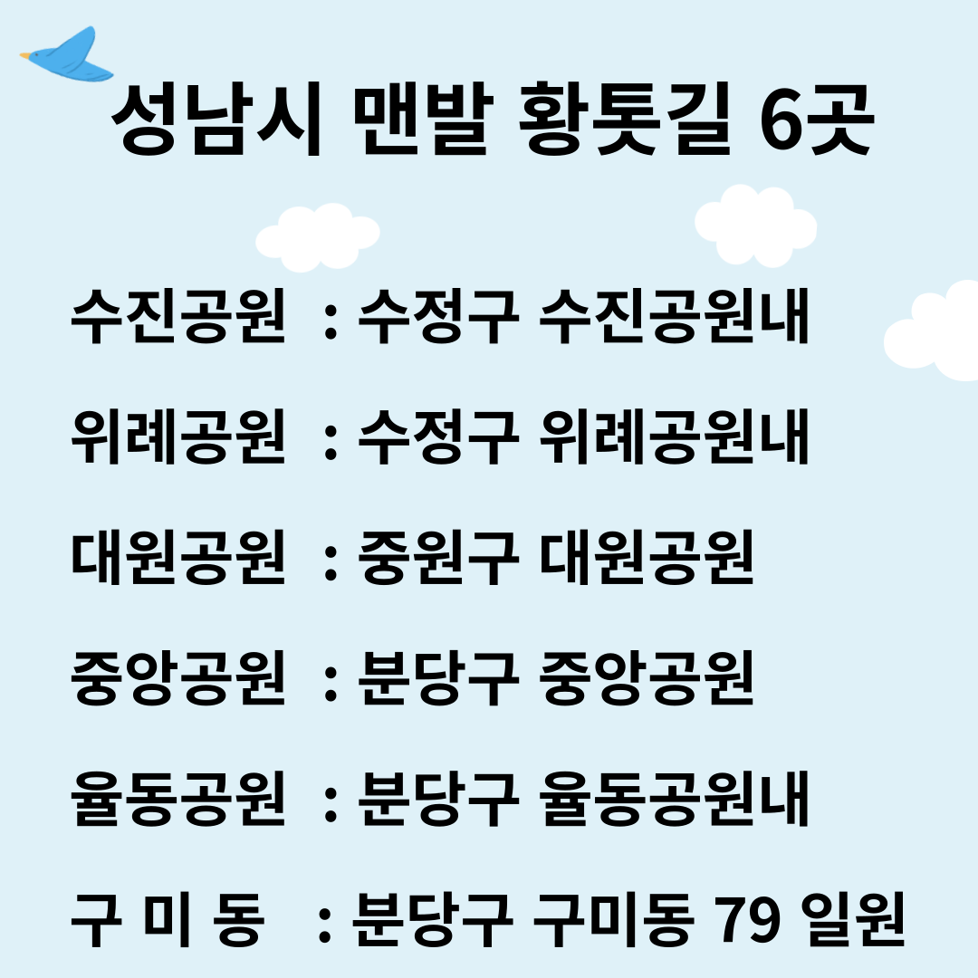 최근 들어 여러 지차체에서 맨발로 이용할수 있는 황톳길을 만들었는데 겨울철에는 이용할 수 없습니다. 성남시에는 맨발 황톳길이 6곳이나 있는데 2023년 12월 1일부터 2024년 3월 14일까지 사용할 수 없습니다. 참고하시기 바랍니다.