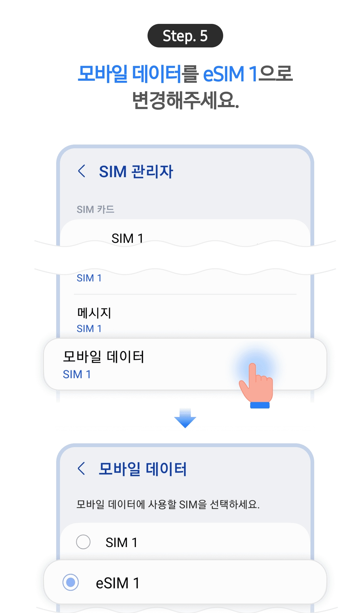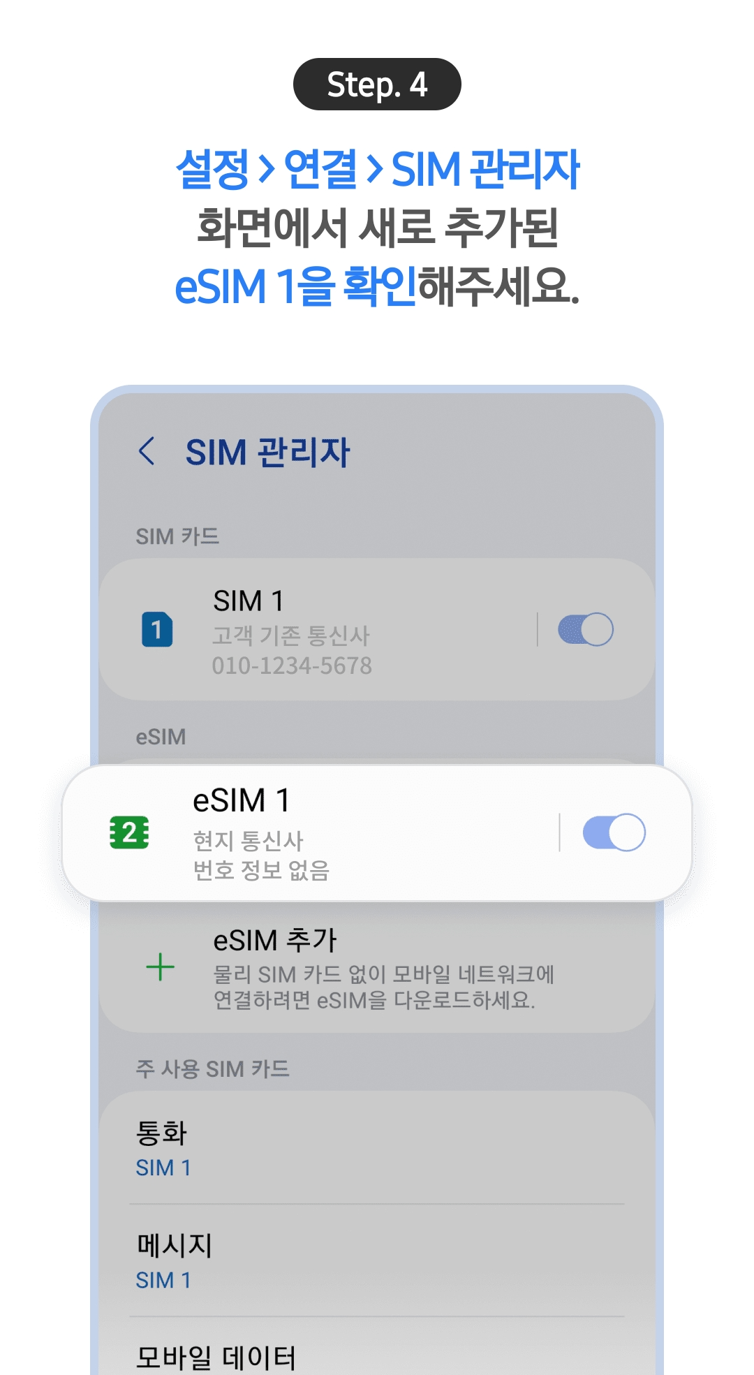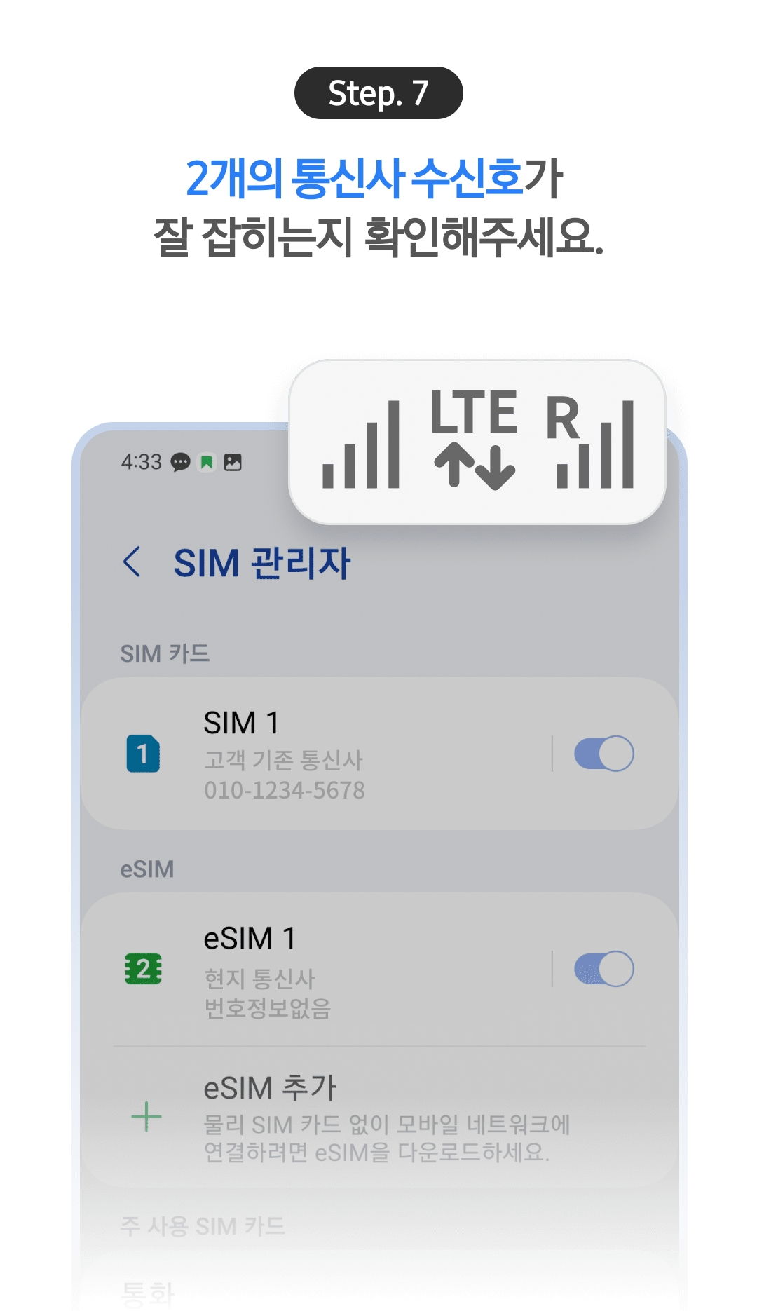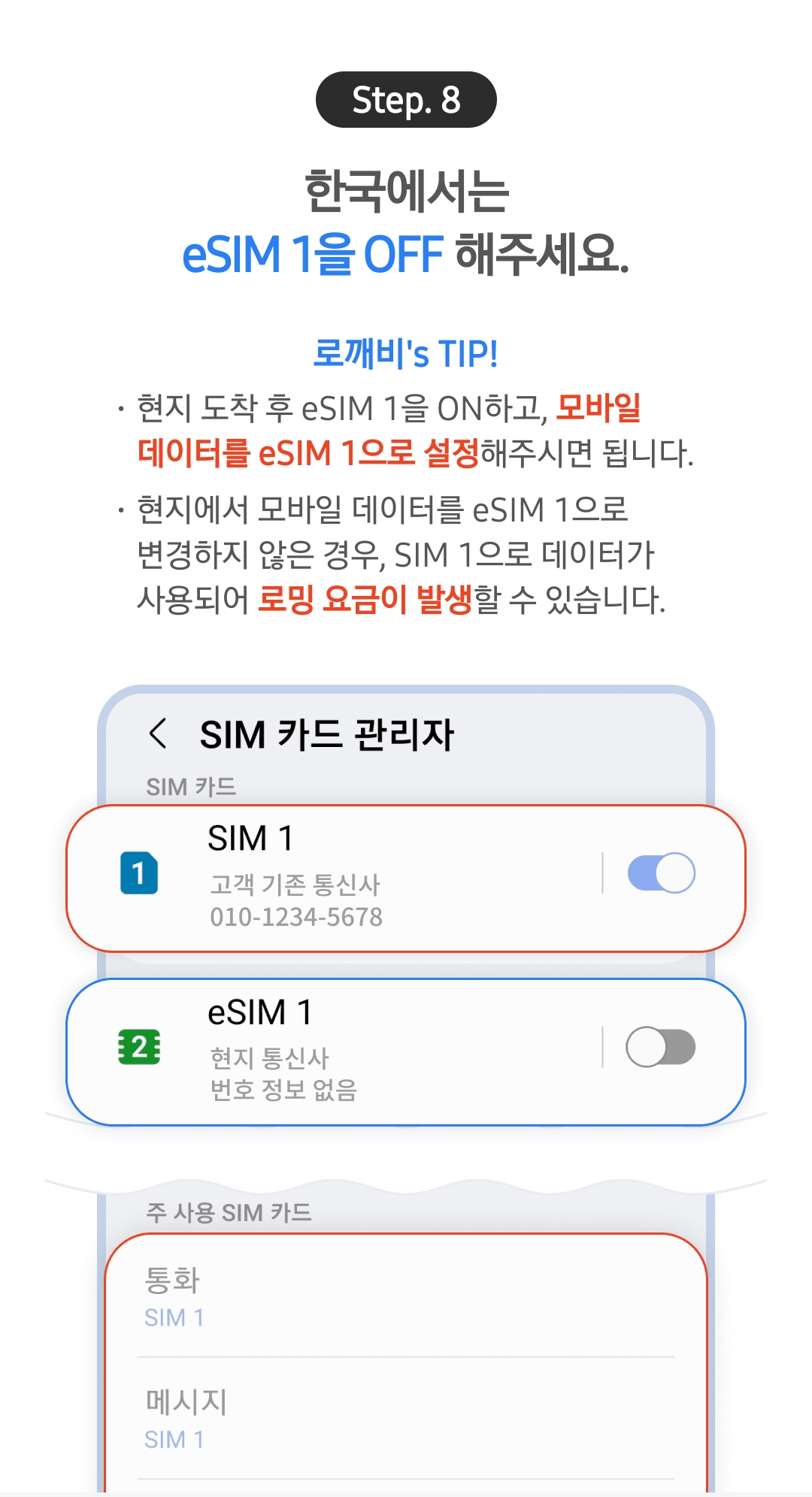 한국에서는 eSIM 1을 꼭 꺼주세요!