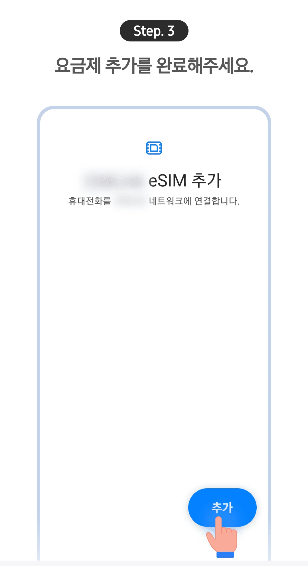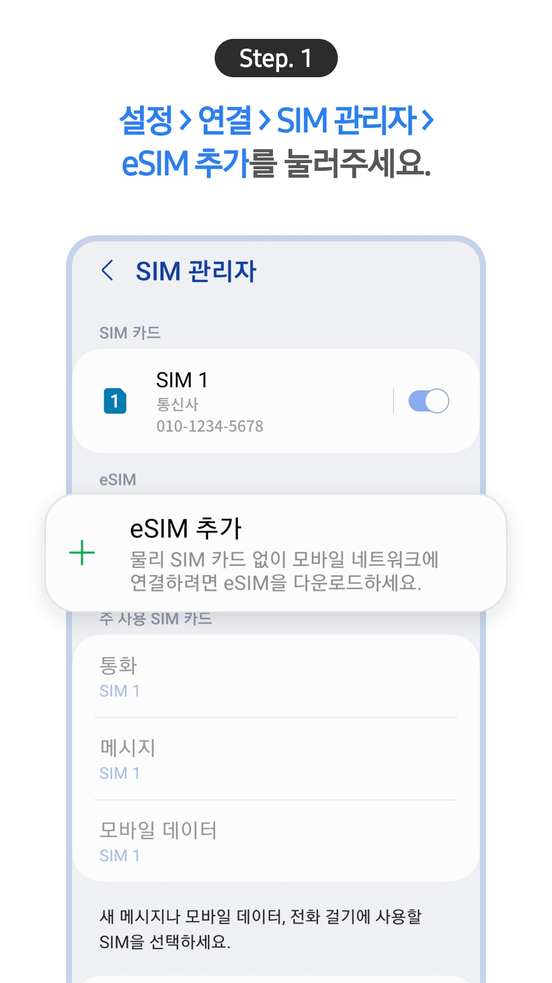 설정 > 연결 > SIM 관리자 > eSIM추가 방법 선택 > QR코드 스캔 > SIM 정보 확인후 > 휴대전화를 네트워크에 연결 >
